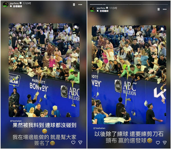赛后周杰伦在社交平台发文:“果然被我料到,连球都没碰到。我在场边能做的就是帮大家签名了。以后除了练球,还要练剪刀石头布,赢的选发球。”