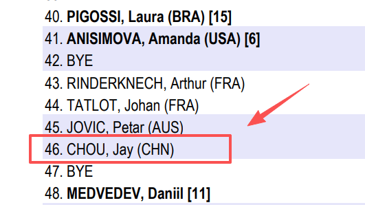 值得一提的是,有眼尖的网友发现,澳网官网当地时间14日发布的签表上,周杰伦(Jay Chou)名字后方的国籍/地区代码被标示为“CHN(中国)”,而非台湾选手在国际体育赛事惯用的“TPE(中国台北)”。