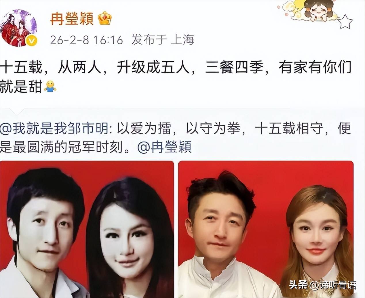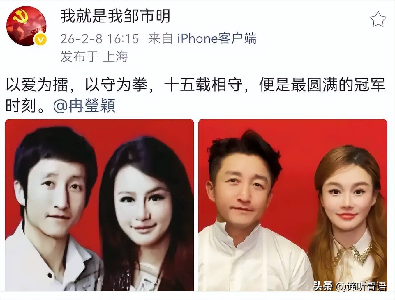 就在今年2月,邹市明和冉莹颖的社交账号几乎同时更新,没有长篇大论,只有两张红底结婚照的对比。