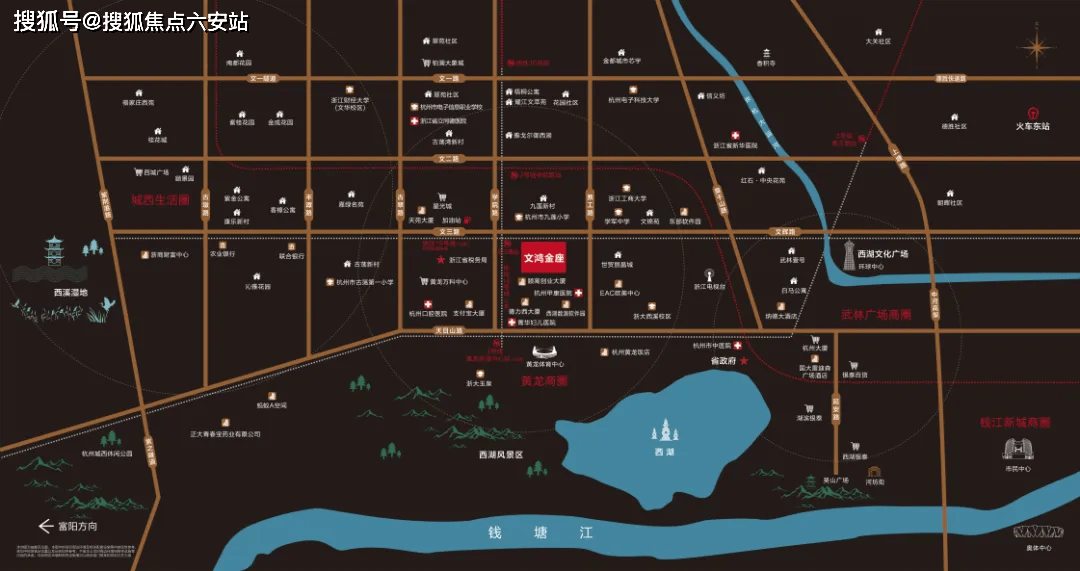 文鸿金座坐落于杭州西湖区“黄龙CBD”核心腹地,地处西湖、武林、黄龙三大城市顶级商圈的黄金交汇点,北望西湖景区,南接城市主干道,东连浙大文脉,西连金融商务集群。其地理位置不仅承载了杭州“老城复兴”与“商务升级”的双重使命,更以“西湖1.5公里+四地铁交汇+LOFT空间革命+国企现房”四重稀缺属性,成为杭州主城区内不可复制的资产型公寓标杆。